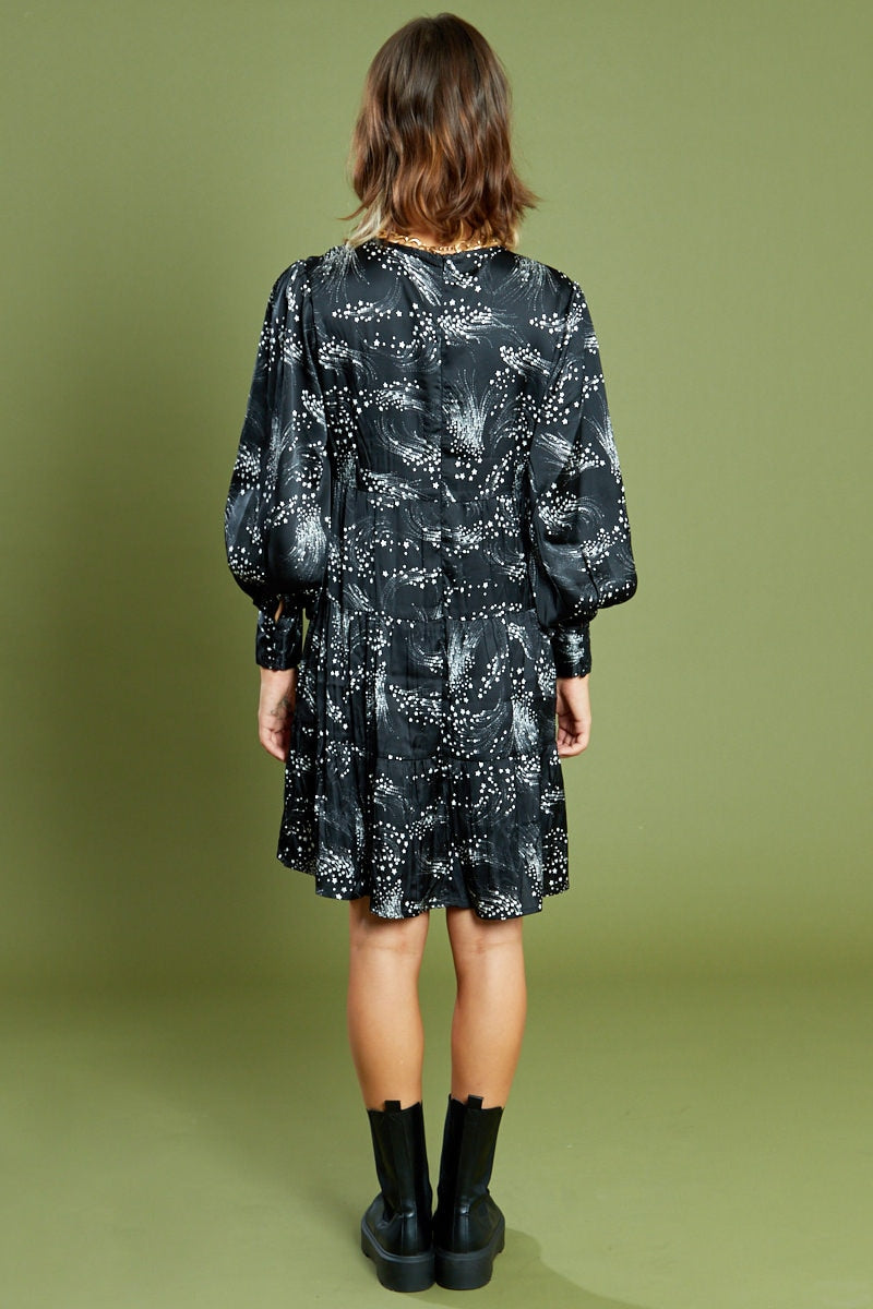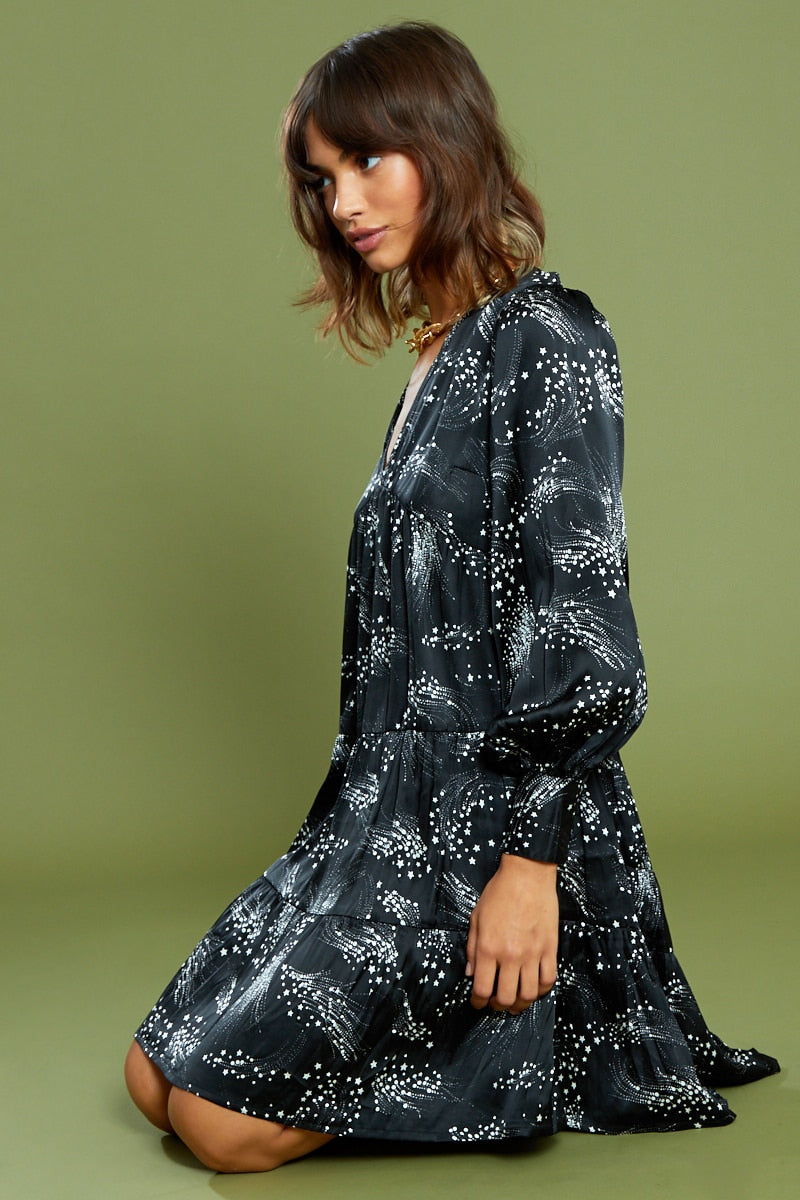 - Black Satin Tiered V Neck Smock Mini Dress with Stars Print